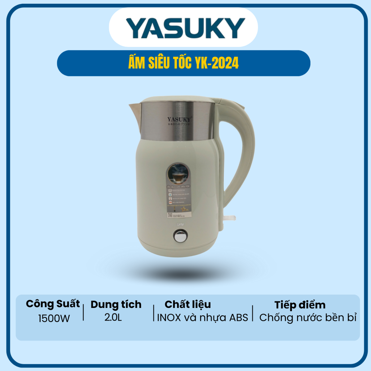 YASUKY YK-2024 là mẫu ấm siêu tốc nổi bật với thiết kế hiện đại, gam màu trang nhã, kết cấu 2 lớp inox đúc nguyên khối và nhựa ABS cao cấp, mang lại độ bền cao, an toàn cho sức khỏe và phù hợp với nhiều không gian bếp gia đình, văn phòng.