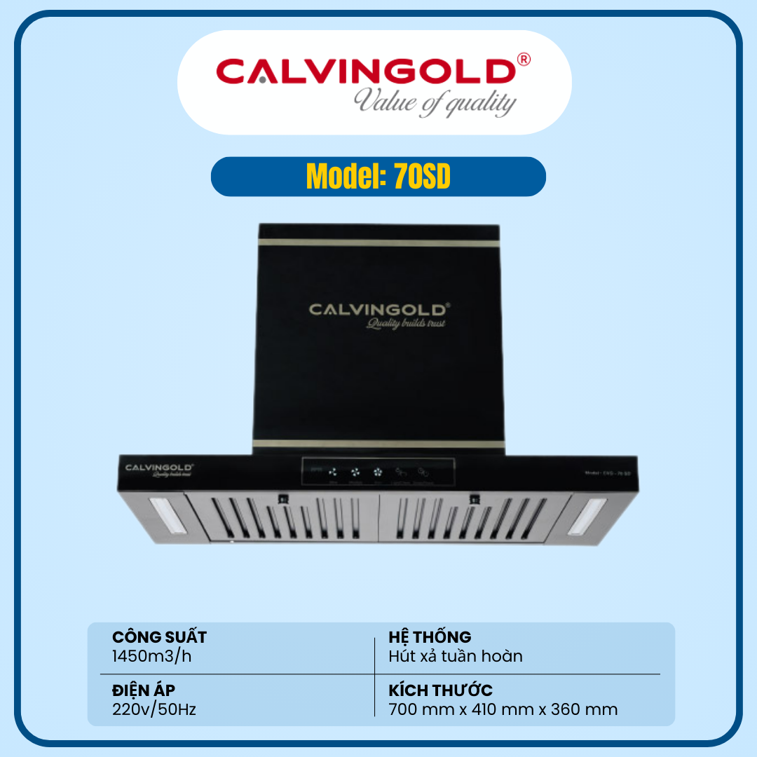 Máy hút mùi Calvingold 70 SD là dòng máy hút mùi cao cấp, nổi bật với thiết kế hiện đại và tinh tế, phù hợp cho các không gian bếp sang trọng. Mặt kính in tráng gương kết hợp thân máy phủ sơn tĩnh điện chống han rỉ mang lại vẻ ngoài đẳng cấp và bền đẹp theo thời gian.