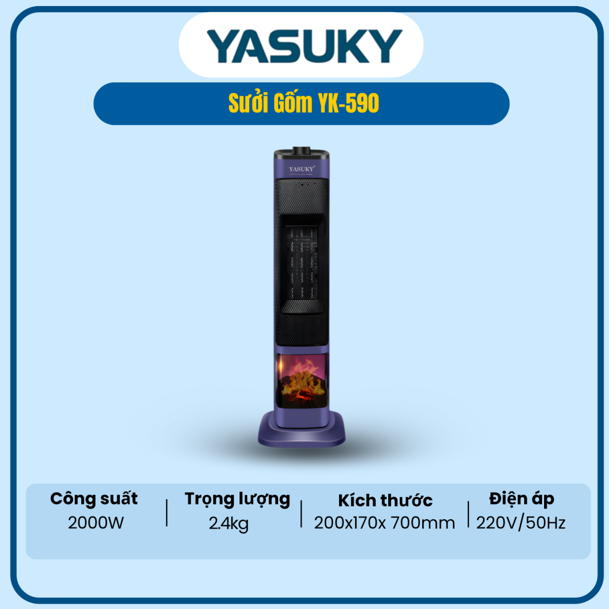 Sưởi gốm YASUKY YK-590 sở hữu thiết kế dạng tháp đứng gọn gàng, phù hợp với nhiều không gian như phòng ngủ, phòng khách, văn phòng hay cửa hàng. Công nghệ sưởi gốm hiện đại giúp làm ấm nhanh, tỏa nhiệt đều, không đốt oxy và hạn chế khô da, mang lại cảm giác dễ chịu khi sử dụng lâu dài.