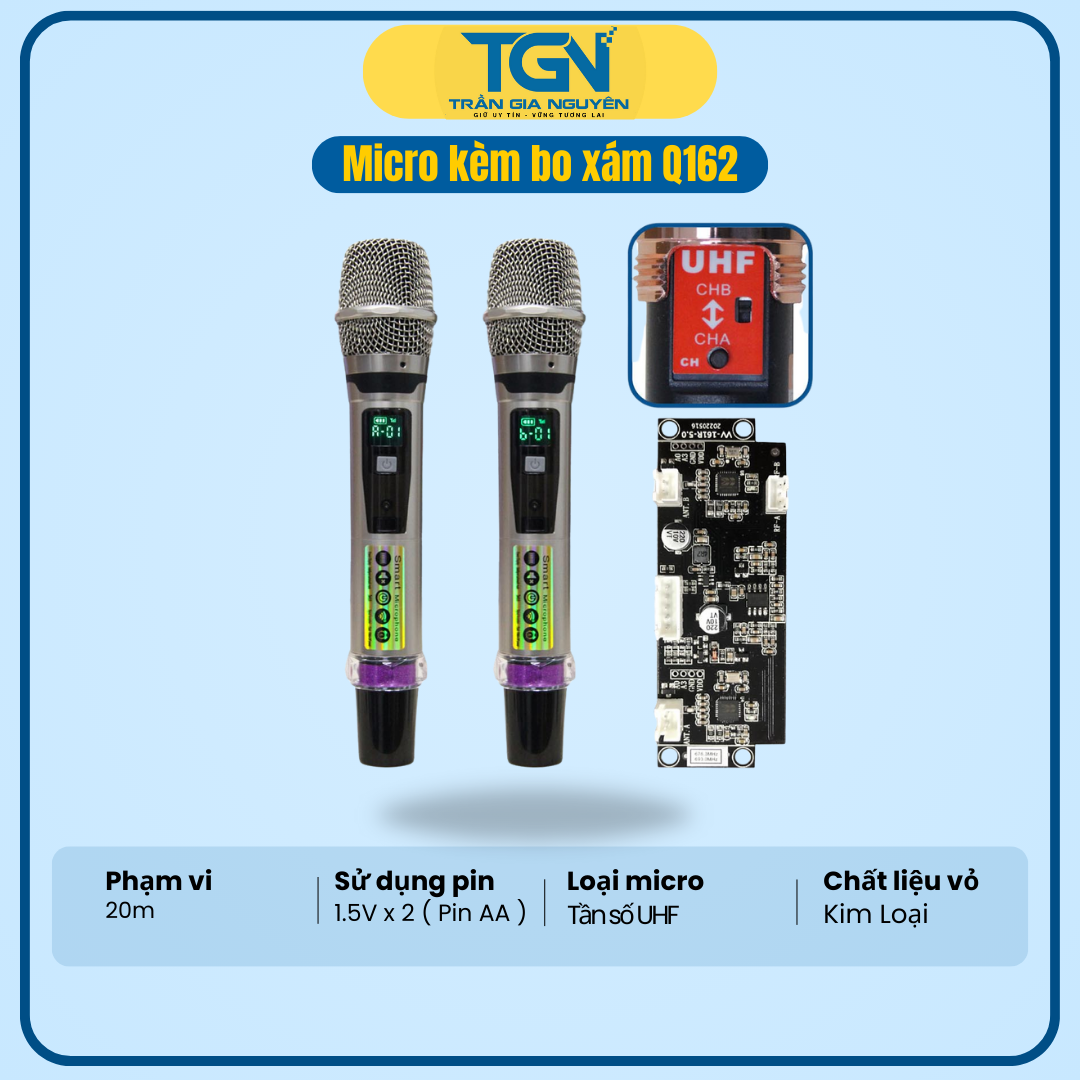 Micro không dây Q162 là dòng micro dành cho loa kéo – dàn karaoke gia đình – sự kiện nhỏ, được thiết kế chắc chắn với vỏ kim loại bền bỉ, chống va đập tốt và mang lại cảm giác cầm đầm tay, chuyên nghiệp.