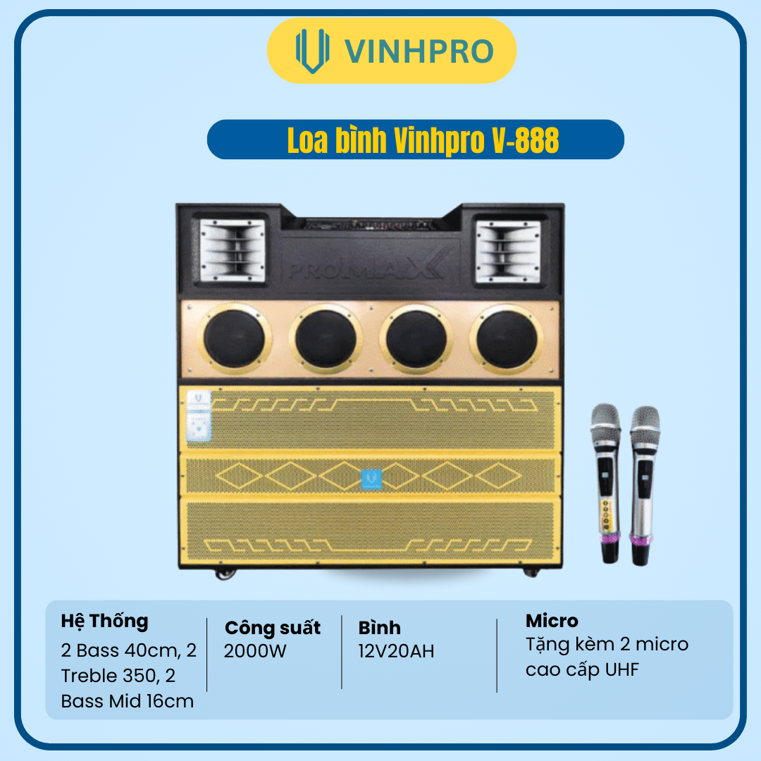 Hệ thống loa của Vinhpro V-888 được thiết kế để đáp ứng nhu cầu âm thanh đa dạng. Loa Bass 40cm cung cấp âm trầm mạnh mẽ, trong khi loa Treble 350 mang lại âm cao sắc nét. Loa Bass Mid 16cm giúp cải thiện dải âm trung, làm cho âm thanh trở nên cân bằng và hoàn hảo cho mọi thể loại nhạc và nội dung âm thanh.