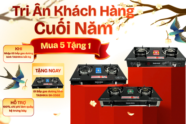 Mua 5 bếp gas TASHIKA – Tặng ngay 1 bếp gas dương kính TASHIKA. Chương trình khuyến mãi đặc biệt dành cho đại lý, cửa hàng. Khi nhập 05 bếp gas TASHIKA bất kỳ, khách hàng được tặng ngay 01 bếp gas dương kính TASHIKA Model SK-3368.