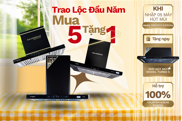 Chương trình ưu đãi lớn dành cho hệ thống phân phối và Đại lý. Khi nhập 05 máy hút mùi CALVINGOLD Model 7050 ECO / 6570 Pro, khách hàng được tặng ngay 01 máy hút mùi CALVINGOLD Model Turbo S.
