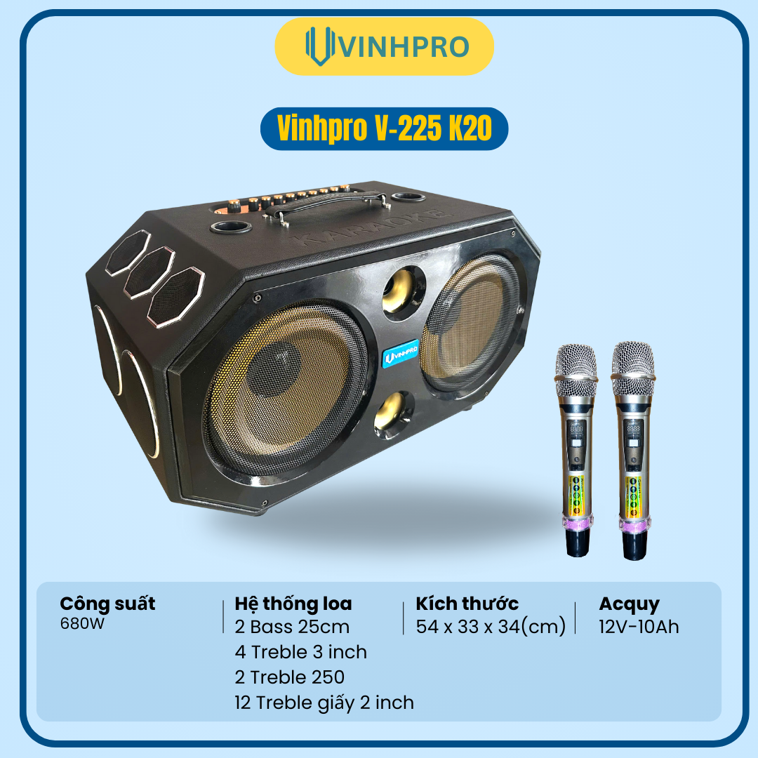 Loa xách tay VinhPro V-225 K20 là lựa chọn hoàn hảo cho nhu cầu karaoke gia đình – bán hàng – tiệc tùng ngoài trời với công suất mạnh mẽ lên đến 680W, mang lại âm thanh lớn – rõ – chắc tiếng.