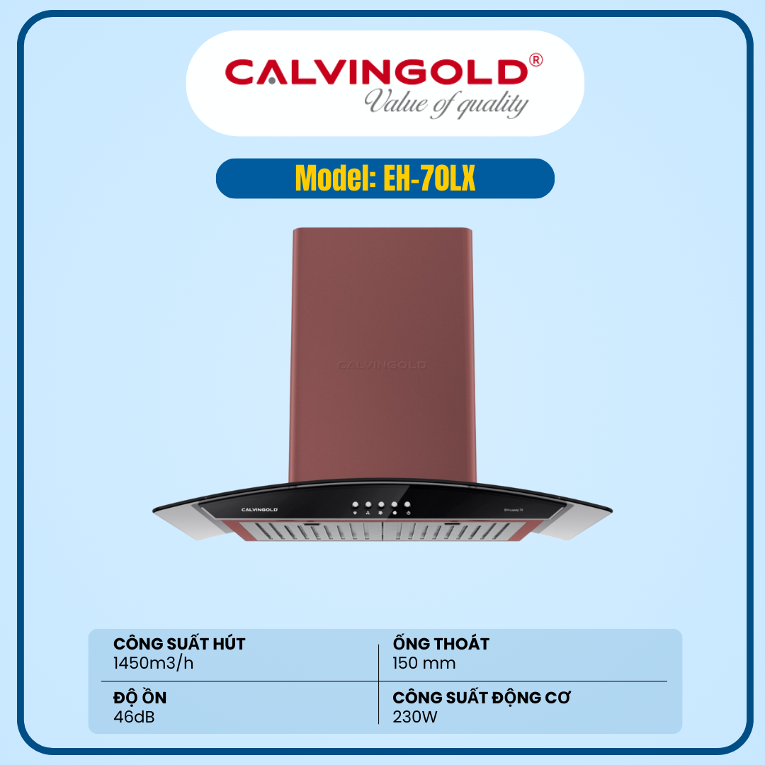 Với hai lựa chọn kích thước 70cm và 90cm, Calvingold EH-LUXURY đáp ứng linh hoạt nhiều không gian bếp, là lựa chọn lý tưởng cho gia đình yêu cầu mạnh – êm – đẹp – bền.