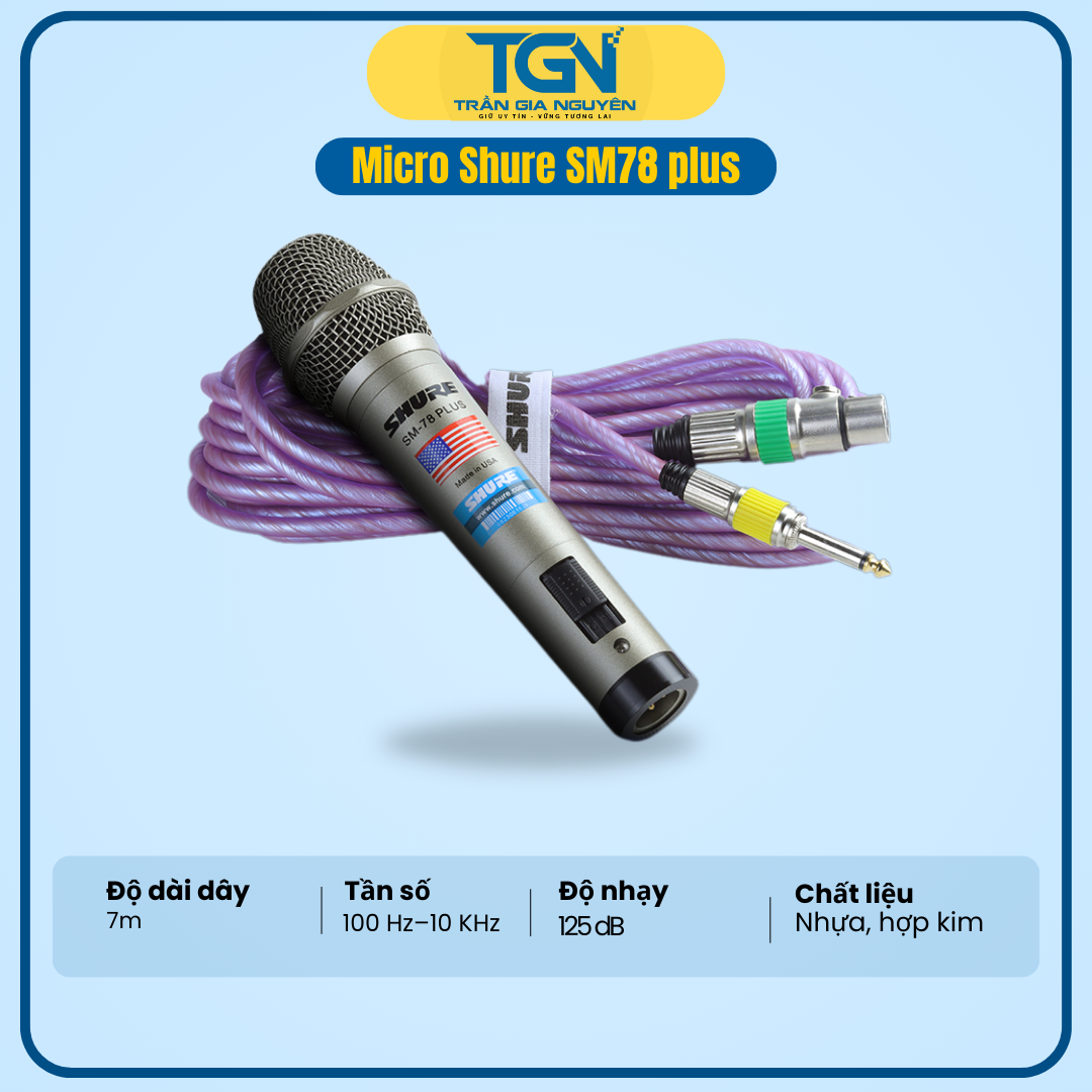 Shure SM78 Plus là mẫu micro có dây chất lượng cao, chuyên dùng cho karaoke gia đình, phòng thu nhỏ, loa kéo, dàn âm thanh mini – quán cà phê – sự kiện nhỏ. Với thiết kế hiện đại, vỏ hợp kim chắc chắn, độ nhạy cao và âm thanh cực kỳ trong trẻo, SM78 Plus là lựa chọn lý tưởng cho người cần micro bền – hát hay – giá tốt.